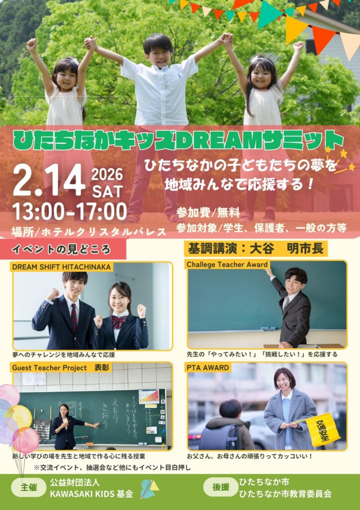 なお、このイベントは、DREAM SHIFT HITACHINAKAを運営している、公益財団法人KAWASAKI KIDS 基金が主催します。また、ひたちなか市、および、ひたちなか市教育委員会の後援を受けています。